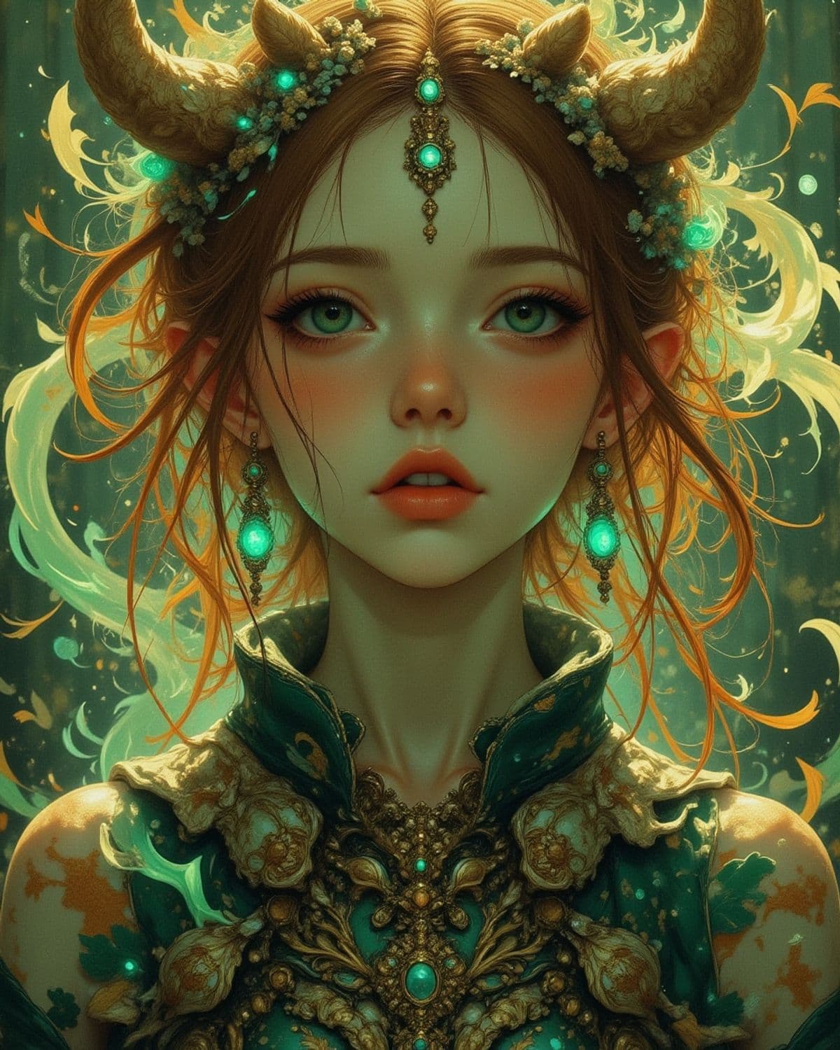 The image features a fantasy portrait of a young woman with ethereal beauty, characterized by delicate features and green eyes. She wears an intricate headpiece adorned with glowing teal jewels and natural elements like horns and flowers. Her attire is ornately designed with a mix of floral and organic patterns, echoing a mythical or woodland theme. The background complements the magical ambiance with swirling patterns and soft, luminous hues.
