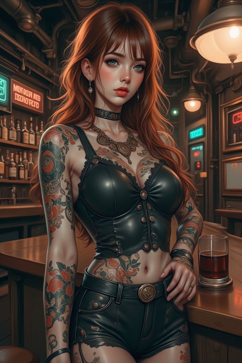 A woman with long, flowing red hair stands confidently in an industrial-themed bar. She is adorned in a black leather outfit, complete with a strappy top and shorts showcasing her tattoos. Her arms and midriff display intricate floral designs. The setting is dimly lit, with bottles lined up behind the bar and warm overhead lighting. Her expression is poised and captivating, hinting at a story behind her gaze.