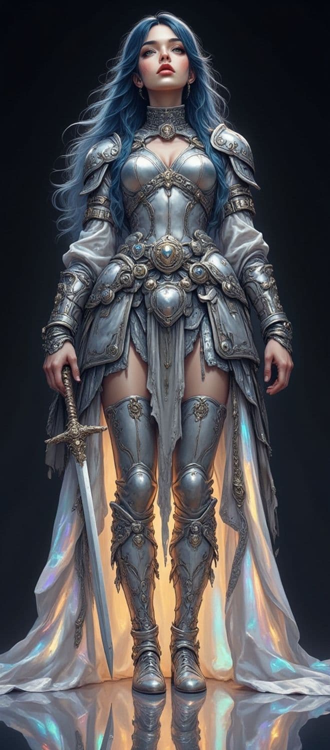 An ethereal warrior woman stands poised with regal confidence. Her long, flowing blue hair frames a composed face, and she is adorned in intricately detailed silver armor with gold accents. The armor, elaborate and ornate, encases her from shoulders to boots, with an attached flowing cape of iridescent fabric that seems to glow. She holds a decorated sword by her side, exuding strength and mystery.