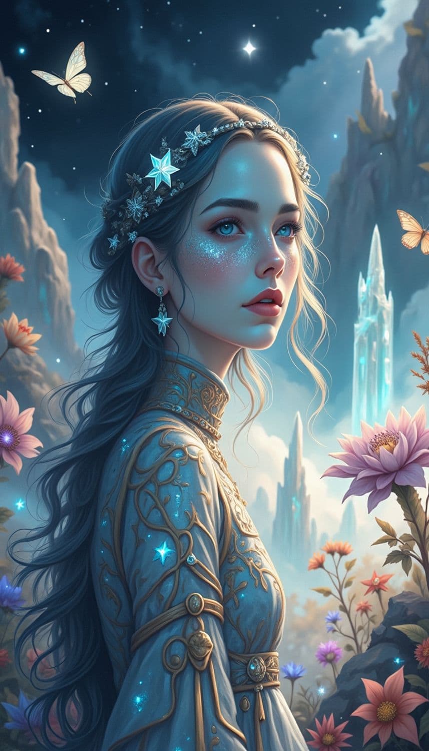 In a futuristic, crystalline garden suspended in the vastness of space, a captivating female figure floats amidst an array of bioluminescent plants and holographic butterflies. Her attire is an elegant, flowing gown crafted from a shimmering, reflective fabric that captures the vibrant hues of the garden, blending shades of electric blue and luminescent gold. Her hair, a striking shade of cosmic teal, is styled in an intricate, braided crown that frames a face with delicate, ethereal features. Her eyes, a mesmerizing shade of holographic silver, seem to reflect the vibrant energy of the garden. She wears a delicate headpiece adorned with tiny, floating orbs of light that pulse gently around her, enhancing her futuristic and enchanting presence. The background is a breathtaking scene of towering, crystalline structures and gentle, glowing streams that weave through the garden, creating a serene and enchanting atmosphere. The style is a fusion of sci-fi and fantasy elegance, with a focus on vibrant color tones and intricate detailing, creating a mesmerizing and otherworldly atmosphere.