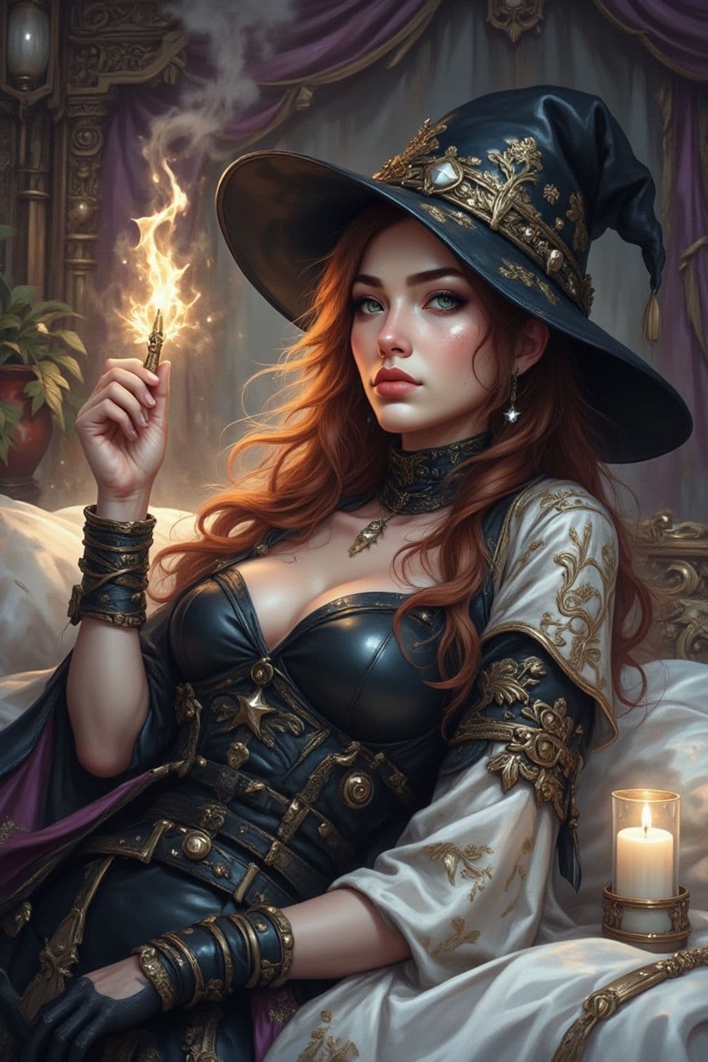 The image features a female character with long auburn hair, wearing a black leather outfit with gold ornate detailing, which includes a top, arm cuffs, and a choker. She wears a large, floppy wizard hat, also black with gold embellishments. She has striking green eyes and a light complexion. In her right hand, she holds a small, bright flame that flickers vividly. The background includes plush purple drapery and an intricately carved wooden element, suggesting an opulent setting. The overall style is hyper-realistic, with a fantasy and gothic theme, emphasizing intricate textures and vibrant contrasts between the dark tones of her attire and the light tones of her skin and the flame.