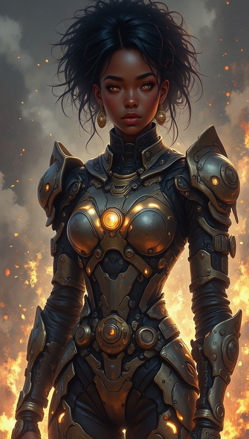 A warrior clad in futuristic, metallic armor with glowing gold and orange accents stands confidently against a backdrop of smoke and fiery embers. Her fierce gaze and elaborate, textured hair add to her imposing presence, while her sleek armor is intricately designed with mechanical details and a bright central core.