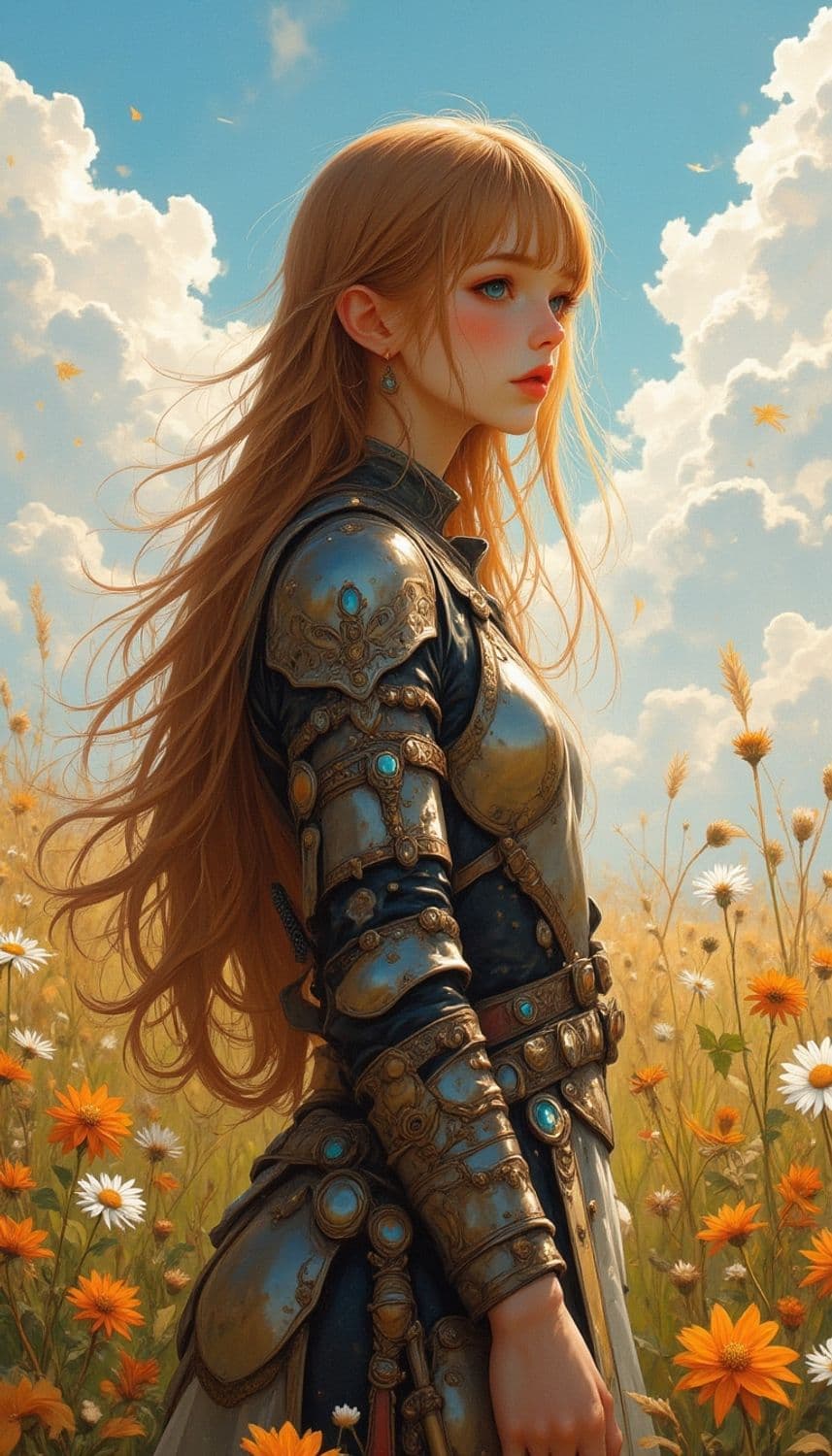 A young woman stands in a field of vibrant orange and white flowers beneath a clear blue sky with fluffy clouds. She wears ornate, golden armor adorned with intricate designs and gems. Her long, flowing hair catches the light, and her expression is serene and thoughtful. The sunlight bathes the scene in a warm glow, creating an ethereal atmosphere.