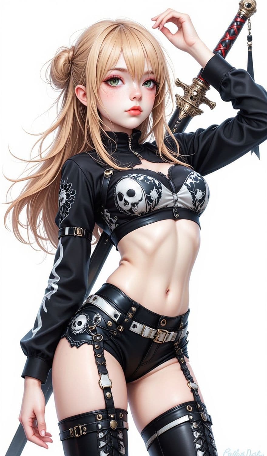 The image shows a fantasy character with long blonde hair styled in a loose bun and bangs. She wears a black leather outfit adorned with skull motifs, featuring a crop top and shorts with straps and buckles. Her expression is confident, and she holds a sword behind her shoulder, emphasizing her role as a fierce warrior. The artwork has a high level of detail, showcasing her toned physique and sharp features.
