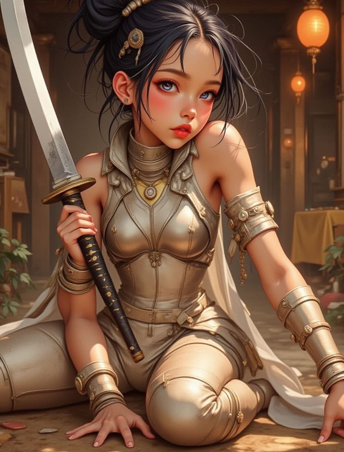 A digital illustration of an anime-style character sitting with a poised, determined expression. She holds a katana in her hand, dressed in a metallic, intricately designed armored suit adorned with decorative patterns. Her hair is styled up with ornate hairpins. The background is softly lit with warm, ambient lanterns.