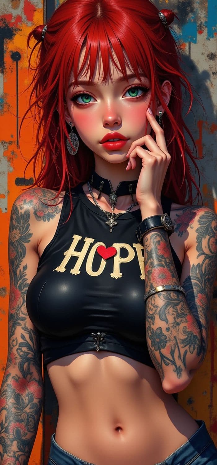 The image features a young woman with vibrant red hair and striking green eyes. Her hair is styled with small buns, and she wears large, ornate earrings. She has a confident expression, with a hand gently touching her face. Her outfit includes a black crop top emblazoned with the word 'HOPE' in bold letters, accented by a heart. Both arms feature intricate floral tattoos, and she accessorizes with a choker and jewelry. The background consists of a colorful, textured wall.