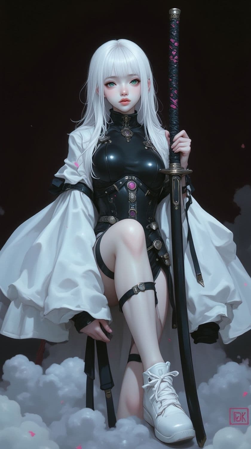 A striking figure with long white hair and captivating green eyes stands confidently. Dressed in a futuristic black leather outfit with intricate designs and a flowing white cape, she exudes an enigmatic presence. She holds a sword with a detailed handle wrapped in black and pink, poised amidst a dreamy cloud-like backdrop.