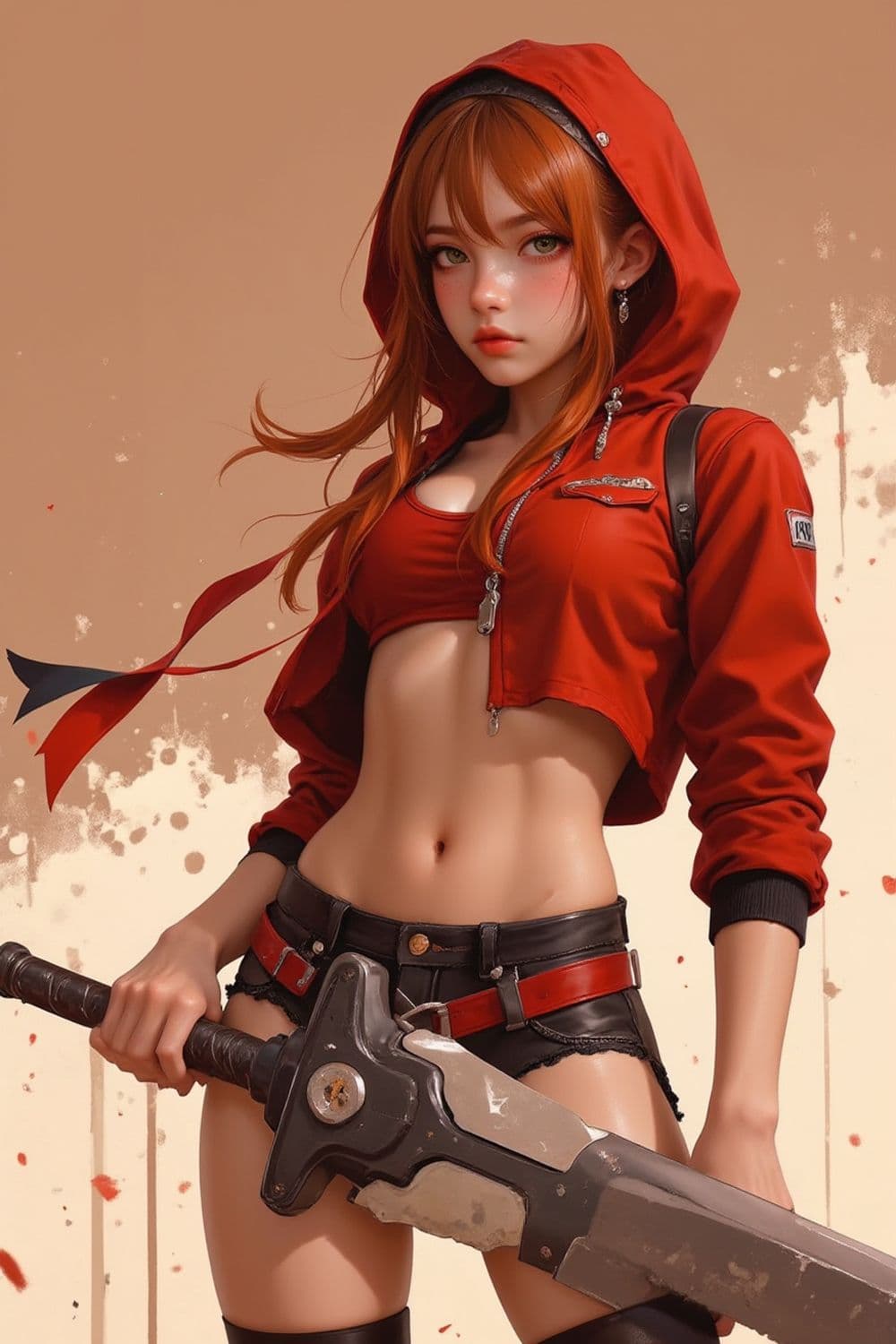 The image features a young woman with long, flowing auburn hair, wearing a red hooded jacket and a cropped top beneath. Her expression is serious, and she holds a large, intricate sword. Her attire includes black shorts with red accents, and her overall appearance is bold and confident, set against a simple beige background with splatters of color.