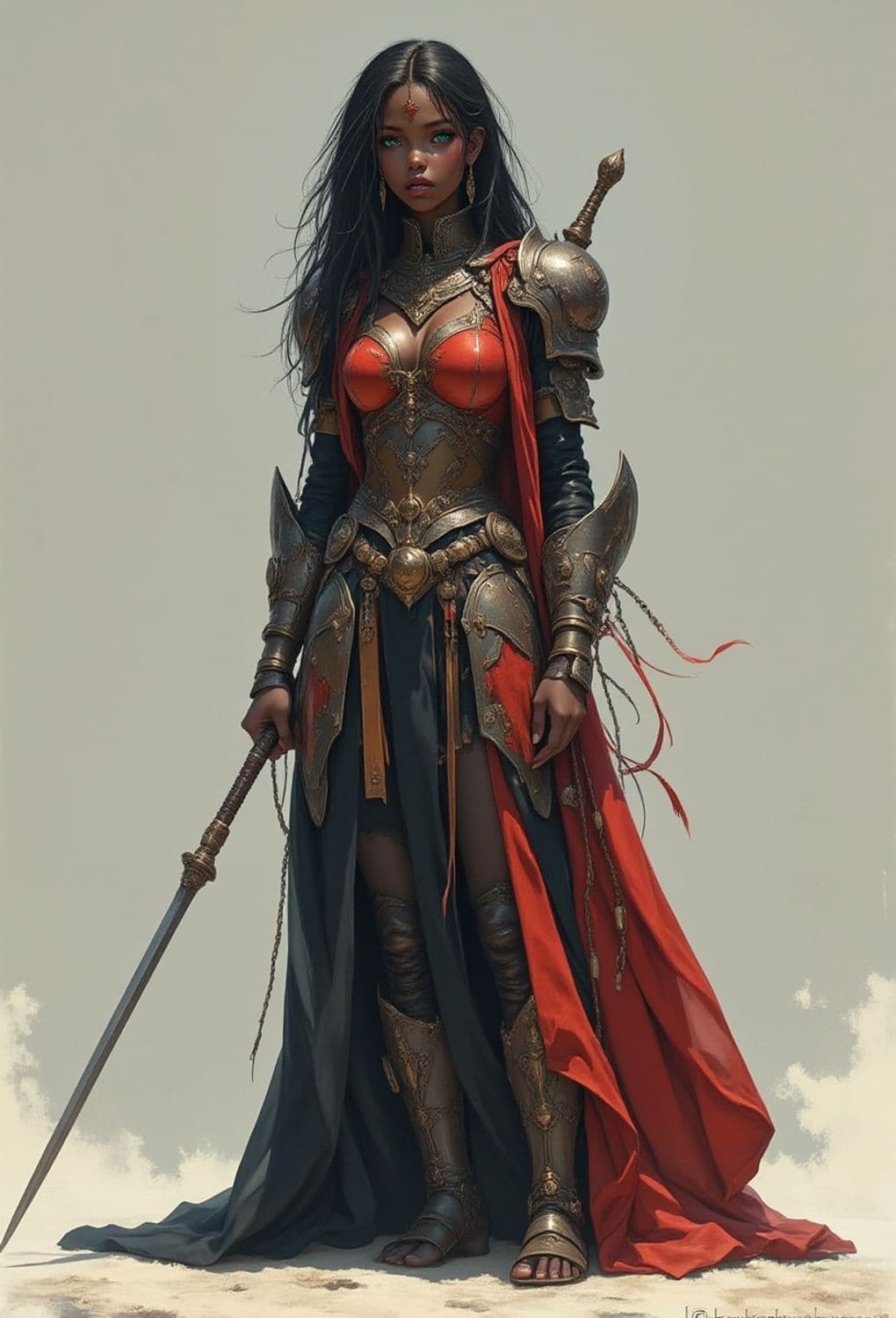 A powerful warrior stands with grace and confidence, her striking armor intricately designed with gold and red detailing. Her long, dark hair flows elegantly, and her focused gaze is complemented by a commanding presence. She holds a sword in one hand, while a cloak drapes over her shoulders.