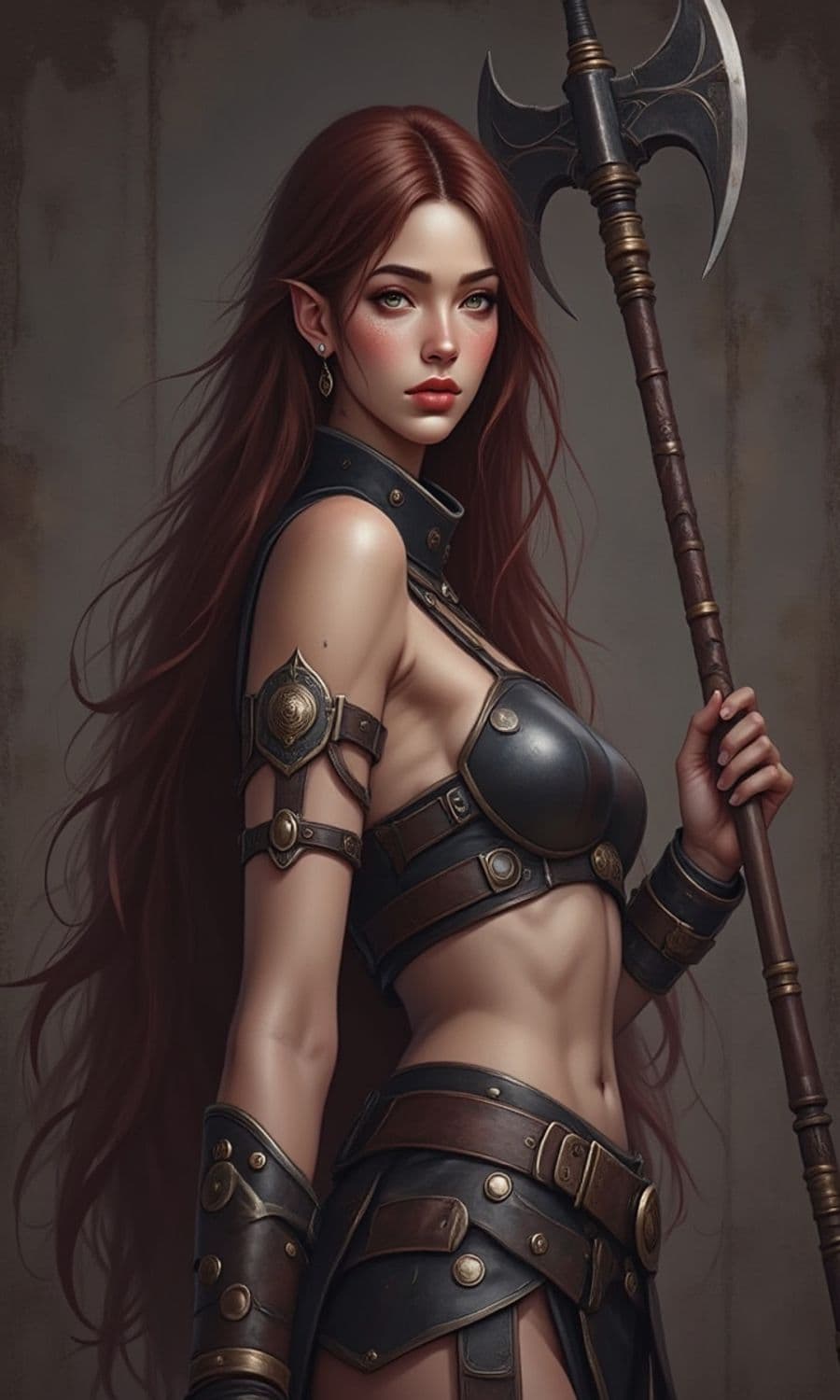 A fantasy female warrior with long auburn hair and pointed ears. She is wearing intricately designed leather and metal armor while holding a large double-headed axe. Her confident gaze is directed towards the viewer, with a detailed background that enhances the mystical and powerful essence of her character.