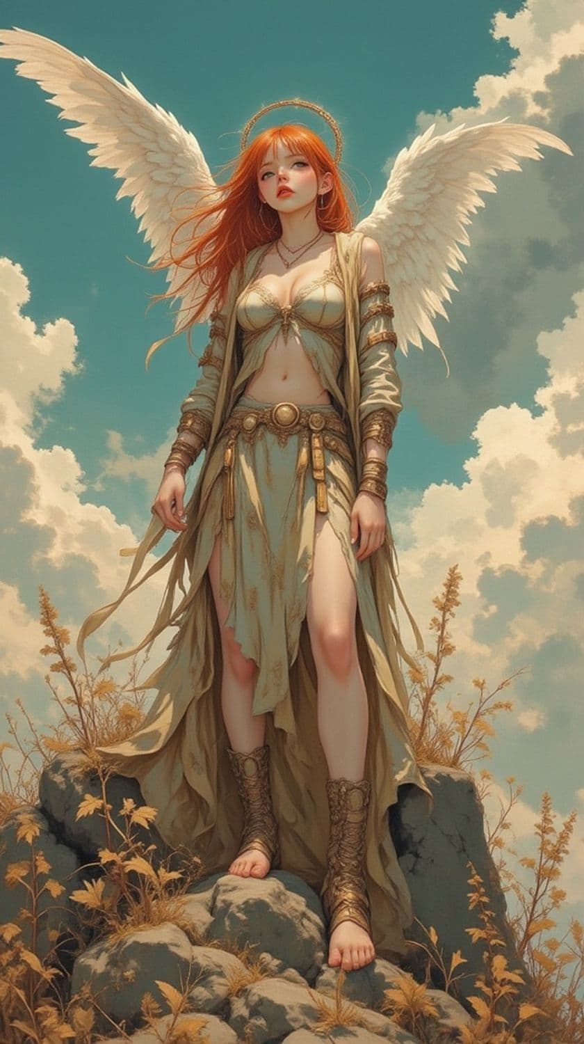 A celestial figure with flowing red hair stands majestically on a rocky outcrop. She is adorned in a flowing, ethereal gown with intricate gold detailing and a celestial halo. Her large, white angelic wings are spread wide against a serene blue sky filled with soft clouds.