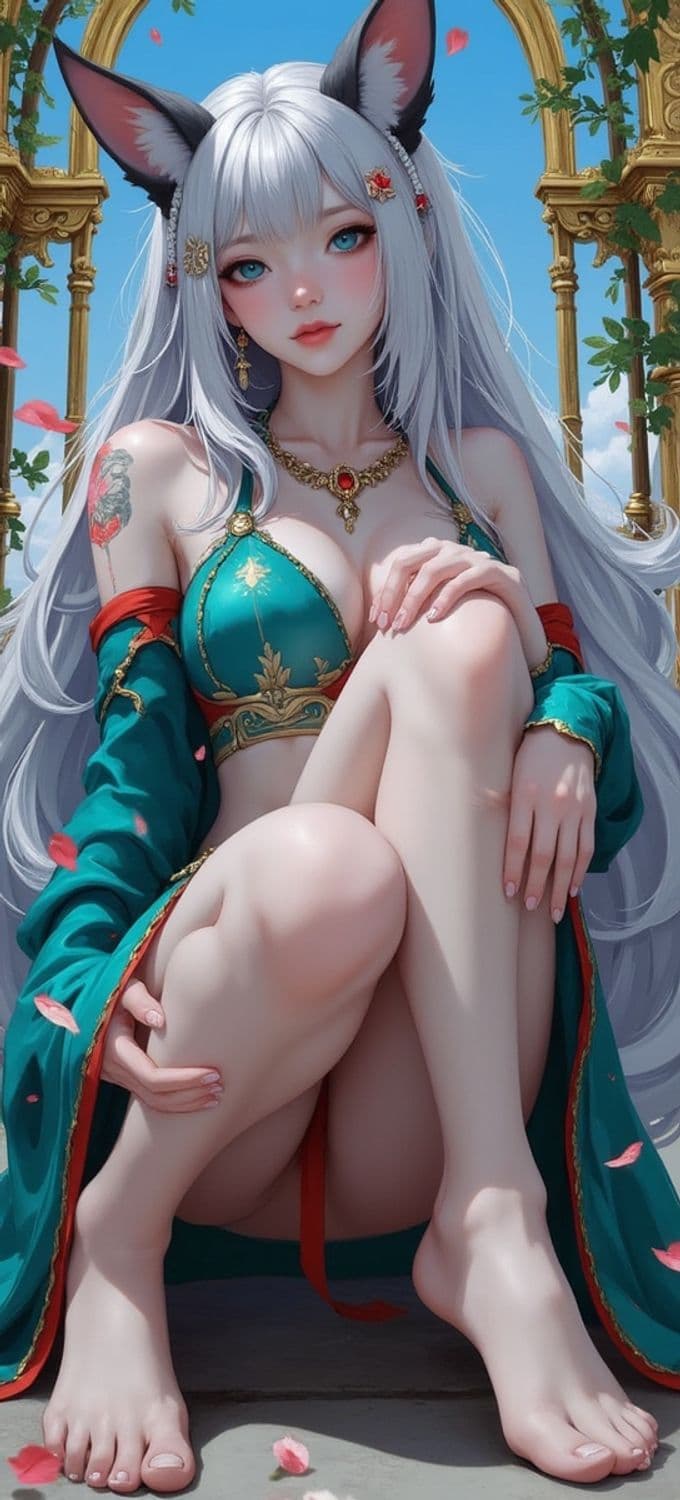 A fantasy character with long white hair and large cat-like ears sits gracefully amid ancient arches. She is wearing ornate teal and gold attire that highlights her elegant form. Her eyes are vivid and her expression serene, with falling petals adding a touch of whimsy. The background includes ornate golden arches intertwined with greenery against a bright blue sky.
