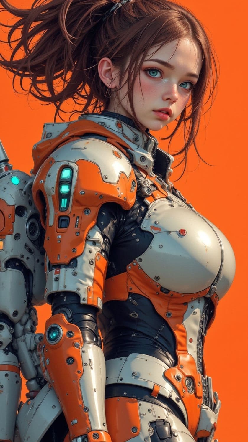 A futuristic female figure is depicted against a vibrant orange background. She wears an intricate, high-tech suit featuring orange and silver panels with glowing elements, showcasing a blend of hard metal and mechanical components. Her hair is tied up, and she gazes thoughtfully into the distance.