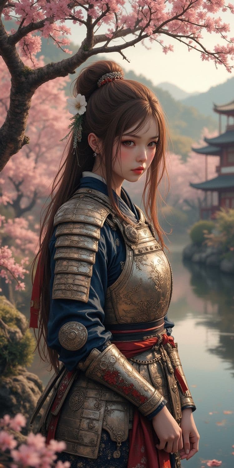 The image depicts a warrior princess standing gracefully in traditional armor surrounded by a serene landscape of cherry blossoms. Her long hair is elegantly tied up, adorned with flowers, and she looks poised and determined. A traditional Japanese building is visible in the background across a tranquil pond, enhancing the serene beauty of the scene.
