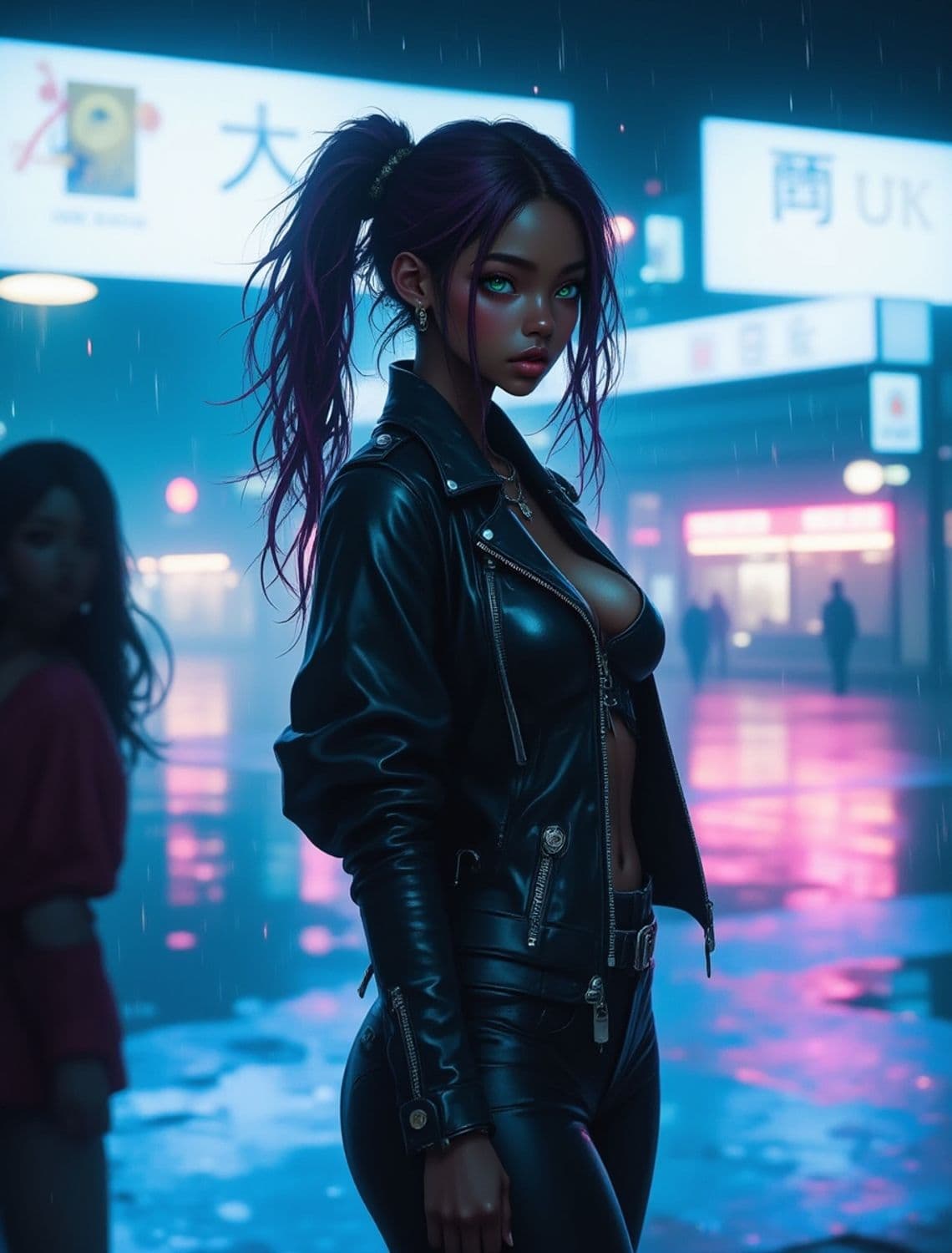 A digitally rendered character stands confidently in a rainy, neon-lit urban environment. She has striking, bright eyes and a high ponytail with purple hair. Her attire includes a sleek black leather jacket and matching pants, enhancing her bold presence. Illuminated billboards and reflections add a futuristic ambiance to the scene.