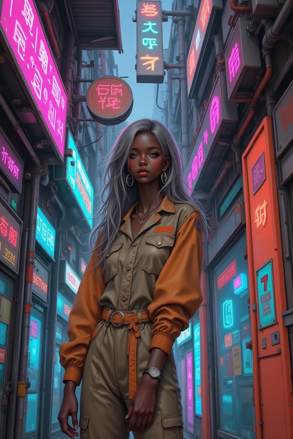 A futuristic scene portrays a woman with striking silver hair standing confidently in a narrow, neon-lit alleyway. Her attire is a blend of modern and practical, featuring a khaki jumpsuit with orange accents. Vibrant signs in pink, blue, and orange illuminate the urban environment, offering a glimpse into a bustling, high-tech city landscape.