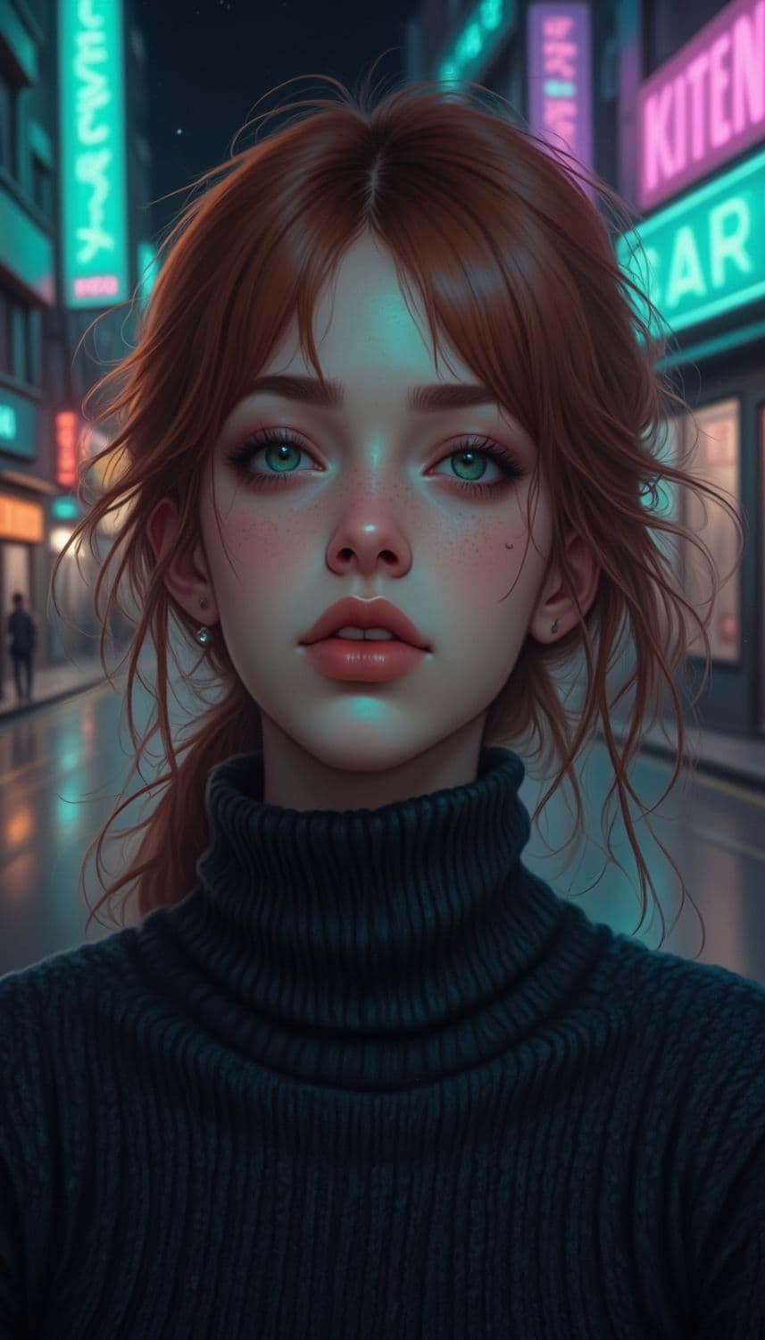 A striking image of a young woman amidst a neon-lit urban landscape at night. Her hair is auburn and slightly tousled, with a soft, natural wave framing her face. She has captivating teal eyes and a light smattering of freckles. Her expression is serene yet intense, as she gazes directly at the viewer. She is wearing a high-necked, dark ribbed sweater, enhancing the glow of the surrounding vibrant signs that form a blurred backdrop.