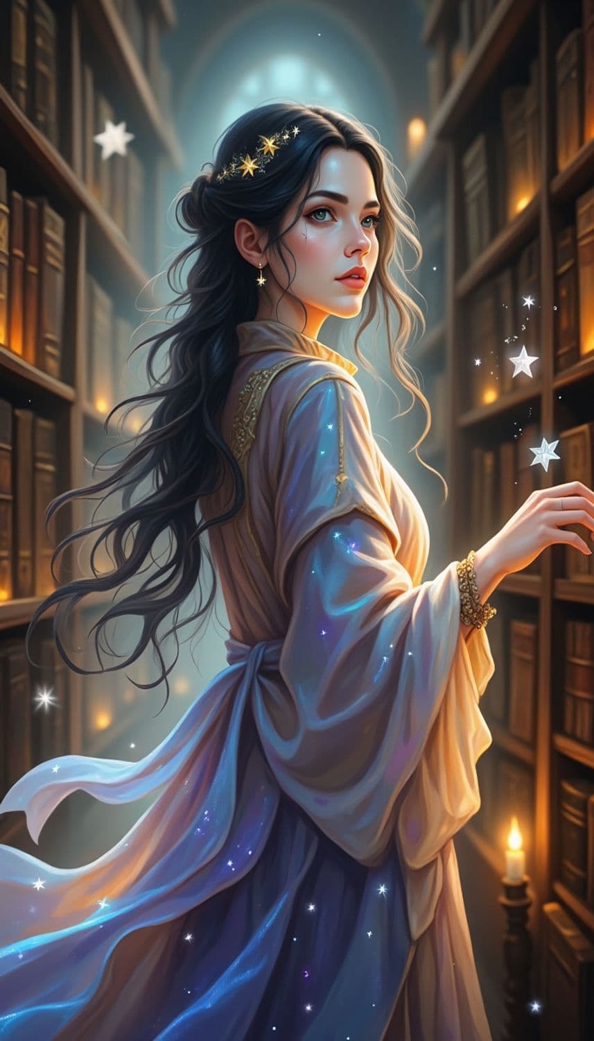 In an ancient, enchanted library, a mesmerizing female figure stands amidst towering shelves filled with glowing, mystical tomes. Her attire is a flowing, ethereal robe crafted from shimmering, translucent fabric that captures the hues of twilight, blending shades of deep blue and soft gold. Her hair, a radiant shade of starlit black, cascades down her back in intricate braids, framing a face with delicate, wise features. Her eyes, a captivating shade of twilight silver, seem to reflect the knowledge and mysteries of the ages. She wears a delicate diadem made of glowing runes and tiny, twinkling crystals, enhancing her magical and otherworldly presence. The background is a breathtaking scene of ancient bookshelves and floating, luminescent scrolls that cast a gentle glow over the scene. The style is a blend of fantasy and ancient mysticism, with a focus on cool color tones and intricate detailing, creating a mesmerizing and otherworldly atmosphere.