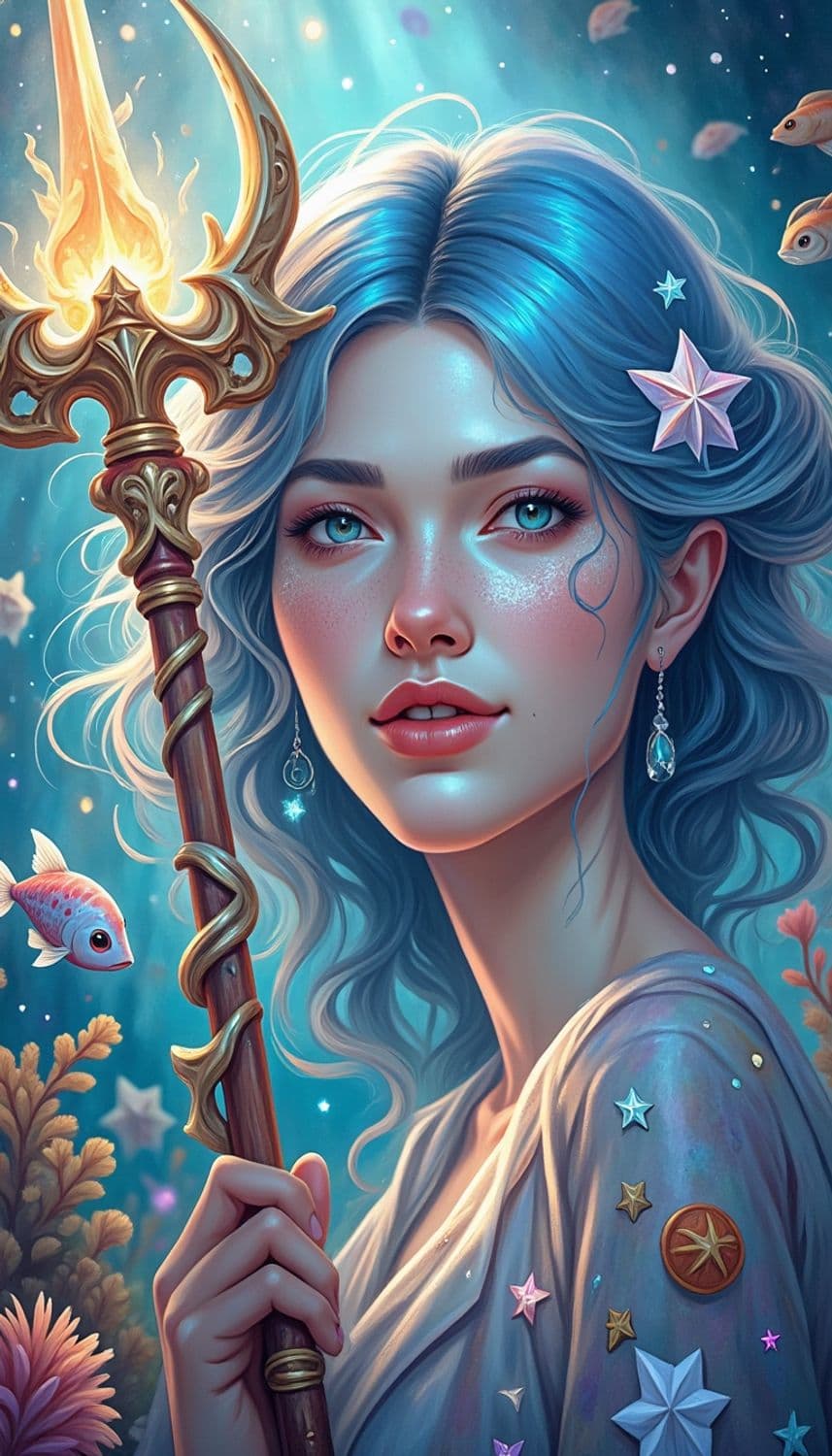 A mystical, ethereal character with blue hair adorned with star-shaped decorations, holding an ornate, glowing staff. Her surroundings are vibrant, with colorful sea-life and an underwater ambiance. Her expression is serene, with sparkling blue eyes and softly blushed cheeks.