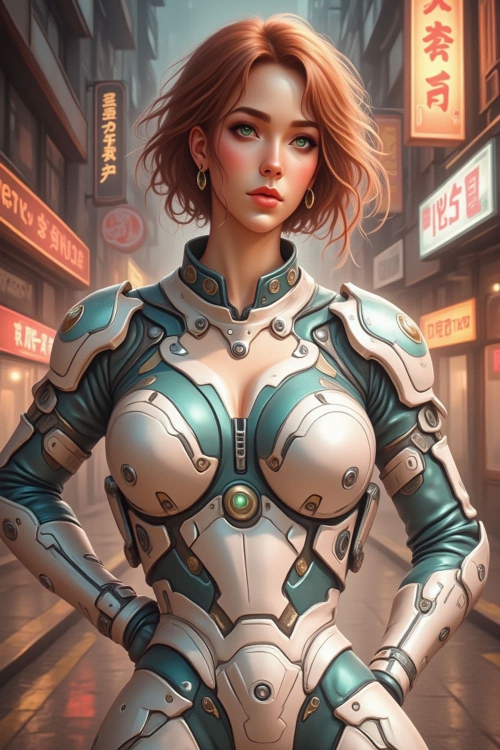 A futuristic female warrior stands confidently in a bustling urban setting, framed by neon-lit signs in an alleyway. Her detailed exoskeleton suit, with teal and silver hues, enhances her powerful presence. Her short, wavy auburn hair and sharp green eyes contrast subtly with the technological armor she wears.