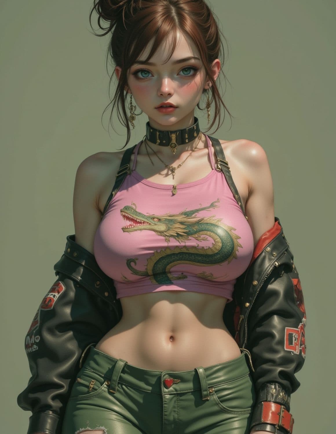 A stylized image of a young woman with large, expressive eyes and full lips. She has her hair in a messy bun and is adorned with a choker, drop earrings, and layered necklaces. Her outfit consists of a pink tank top with a dragon print and green pants. She is wearing a black leather jacket off her shoulders, giving her a confident and edgy appearance. The background is a muted green, highlighting her detailed features and outfit.