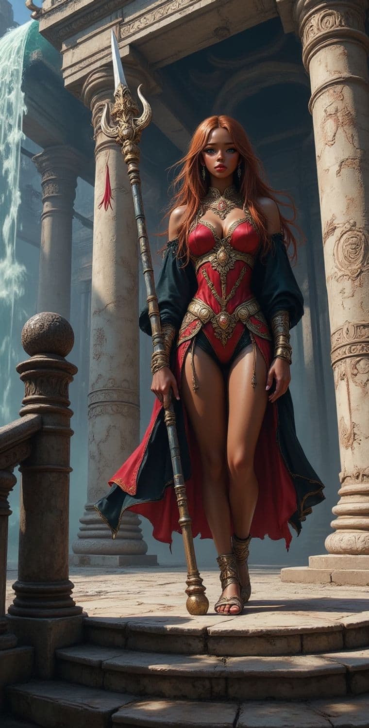A powerful warrior stands confidently among ancient ruins. Her long red hair flows around her ornate armor, which is richly detailed with gold embellishments. She wields a grand spear with an intricate design. The background reveals tall stone pillars and cascading waterfalls, adding a majestic atmosphere.