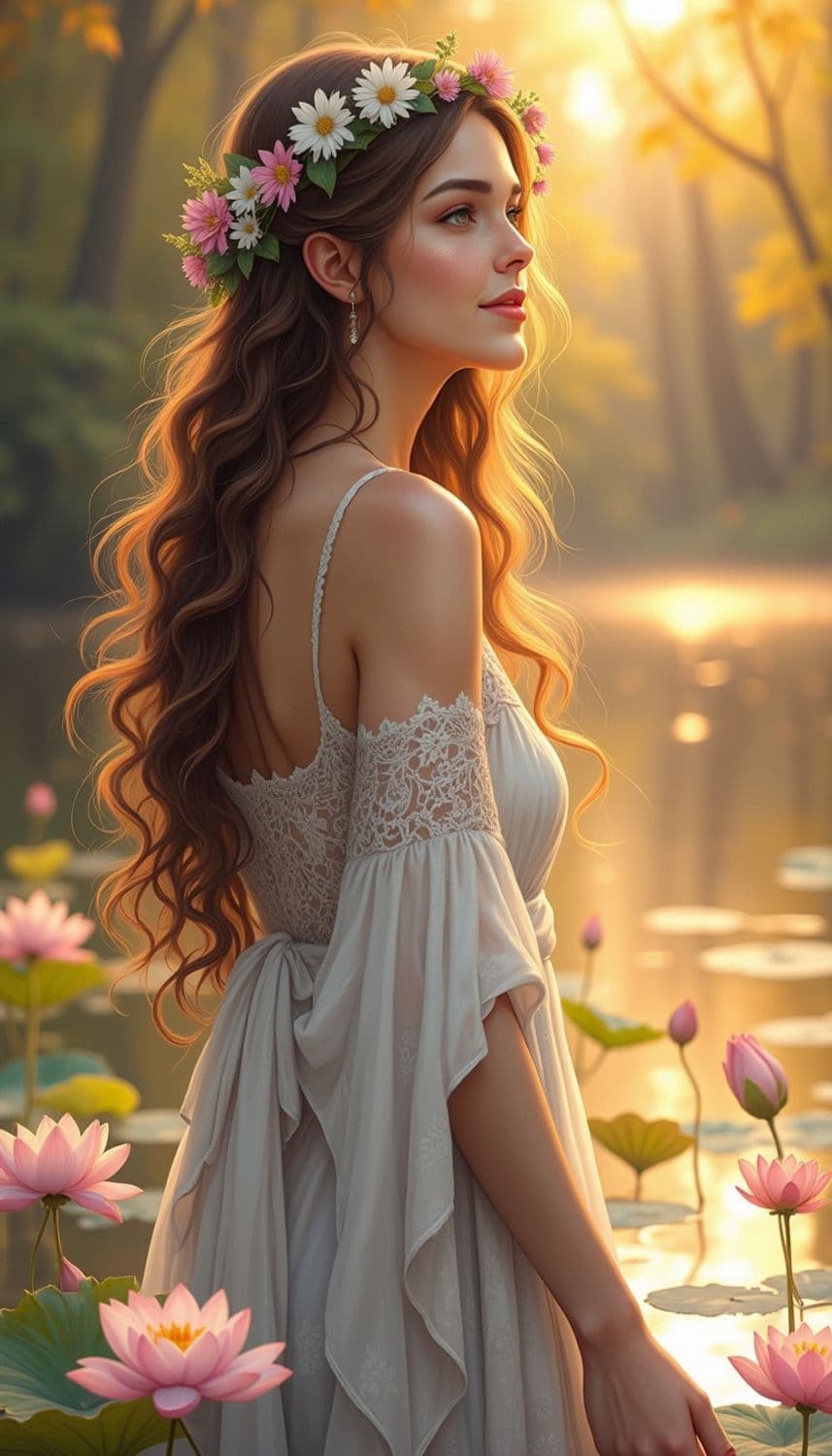 A serene goddess stands by a tranquil lake, surrounded by blooming lotuses. She wears a flowing white gown with delicate lace details, and a crown of flowers adorns her head. Her skin is a warm, sun-kissed bronze, and her gentle smile exudes peace and harmony. The setting sun casts a golden reflection on the water, enhancing the serene and divine atmosphere. The style is peaceful and harmonious, with a focus on natural beauty and tranquility.