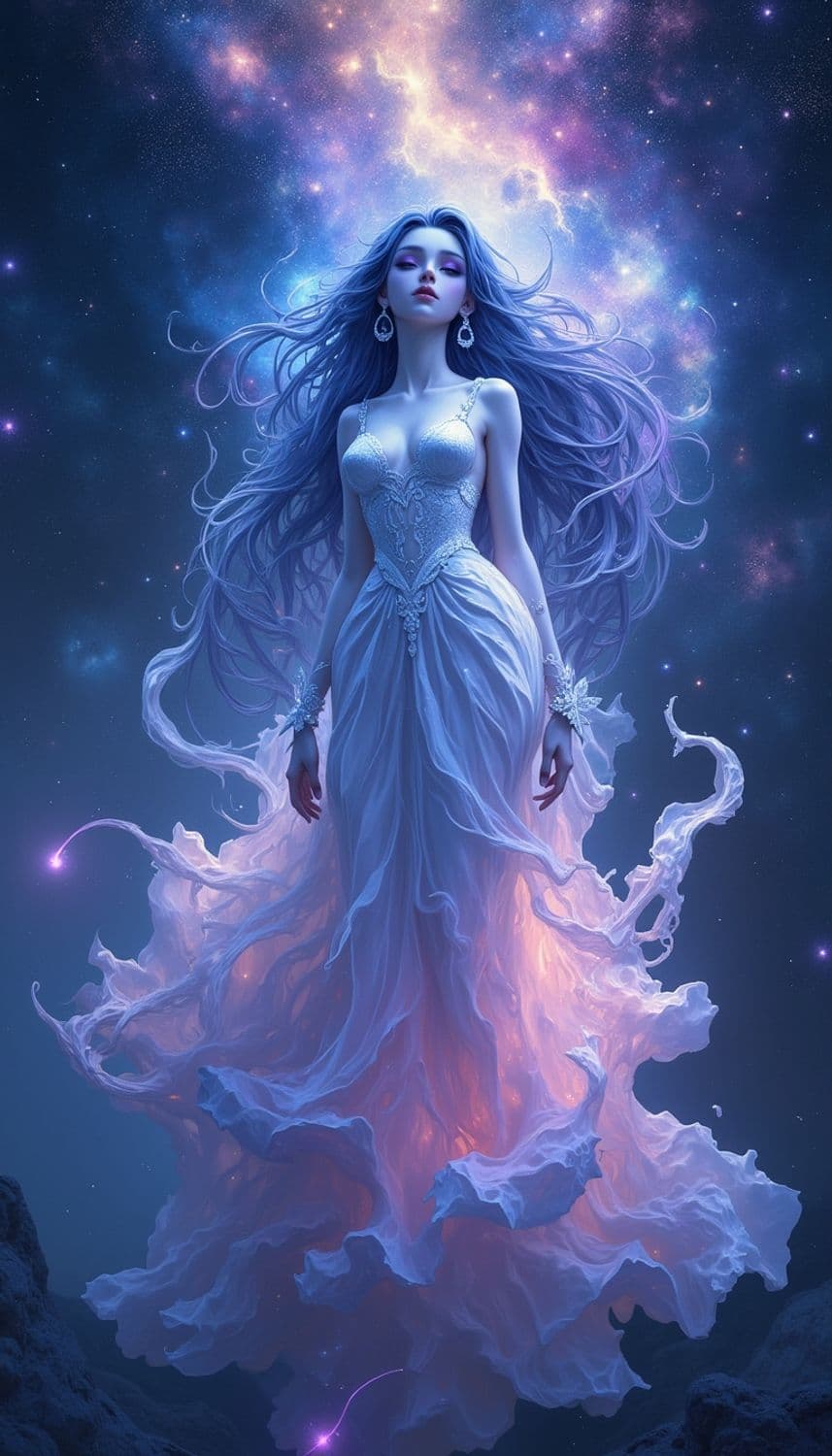 The image portrays an ethereal woman floating in space, surrounded by swirling, luminescent clouds. Her long flowing hair cascades around her while her elegant white gown shimmers with soft purple and pink hues. The cosmic backdrop showcases a vibrant nebula, adding an otherworldly atmosphere to the scene.