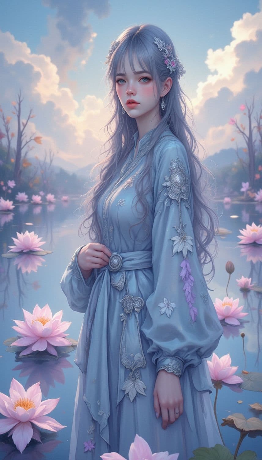 A serene and ethereal woman stands by a tranquil lake filled with blooming lotus flowers. She has long, flowing lavender hair adorned with delicate floral ornaments. Her elegant robe is embellished with intricate lace and floral patterns, blending seamlessly with the dreamy landscape. The soft pastel colors of the sky and distant mountains create a calming atmosphere.