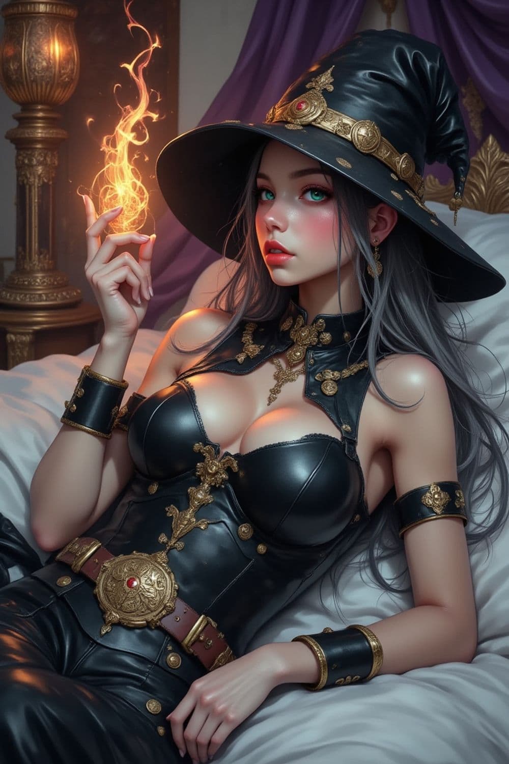 A mystical, enchanting woman with long gray hair, dressed in a detailed black and gold leather ensemble. She holds magical fire at her fingertips, exuding power. A large, adorned witch hat and ornate jewelry add to her bewitching appearance. Rich decoration surrounds her, hinting at a luxurious setting.