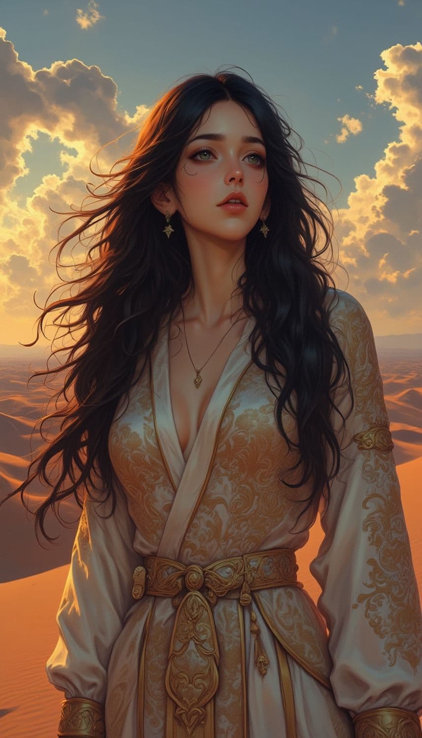 A young woman with long dark hair stands against a backdrop of a desert at sunset. The sky is filled with dramatic clouds illuminated by the sun. She wears an ornate white and gold robe with intricate patterns and a belt. Her expression is serene, looking off into the distance. The warm tones of the desert sand and sky contrast with her striking attire.
