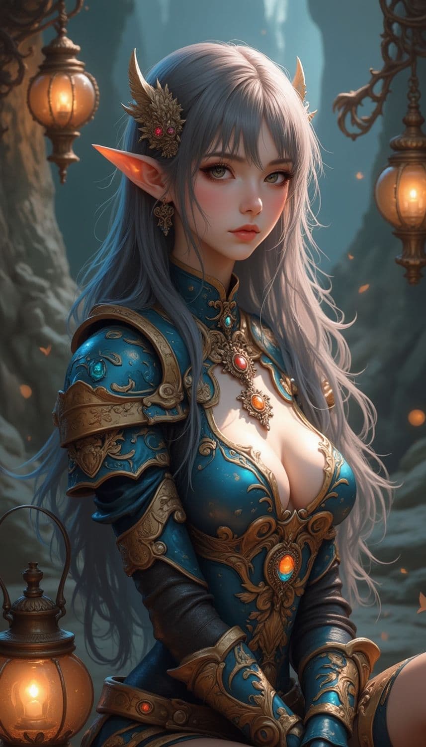 The image depicts a fantasy character with elongated elf-like ears and silver hair. She is adorned in an ornate blue and gold armor with intricate details and gemstone embellishments. A warm, ambient glow from hanging lanterns surrounds her, adding to the mystical cave-like setting.