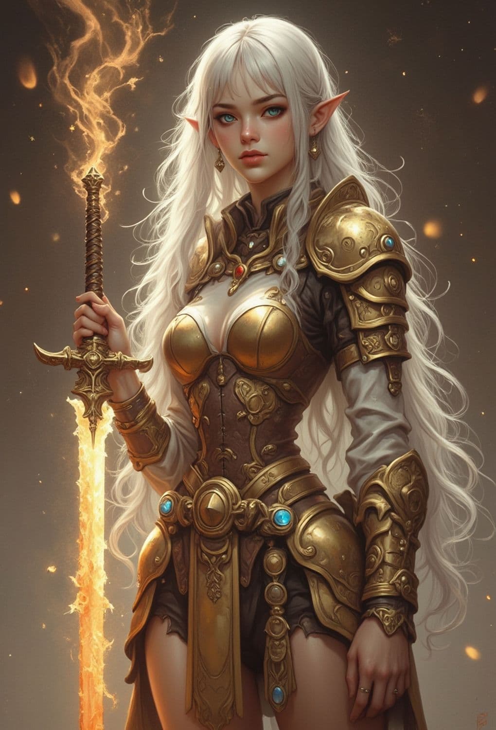 A fantasy warrior stands gracefully with pointed elf ears, dressed in intricate golden armor adorned with jewels. Her long, flowing white hair cascades down her shoulders. She holds an ornate sword emitting a fiery glow, with embers floating around, creating a mystical atmosphere.