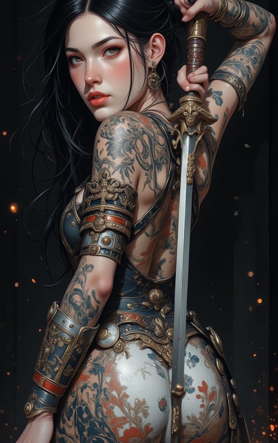 A fierce and elegant warrior stands with a sword poised over her shoulder. She possesses intricate tattoos covering her arms and visible skin, portraying a blend of artistry and strength. Her long, dark hair cascades over her shoulder, complemented by ornate armor adorned with metallic details and intricate patterns. The intensity of her gaze is matched by her poised stance, evoking a sense of power and grace.