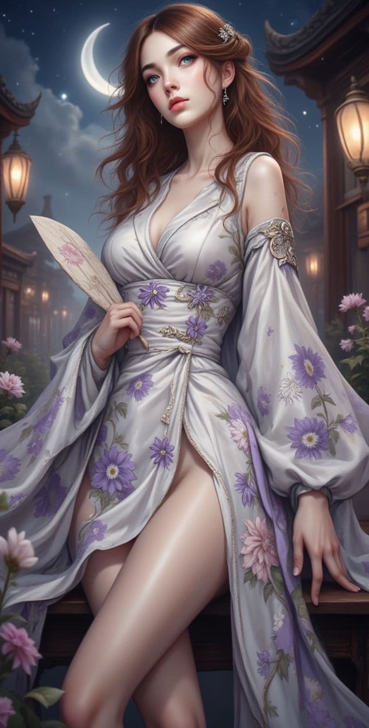 A serene and elegant woman with flowing auburn hair stands under a crescent moon. She is dressed in a delicate, flowing robe adorned with large purple flowers. The gown is cinched at the waist, and she holds a hand fan gently. Lanterns softly illuminate the background, adding a warm glow to the night scene.