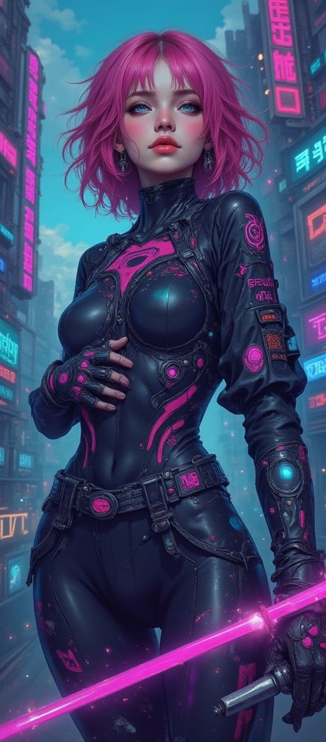 A futuristic warrior stands confidently amidst a neon-lit cityscape. She has vibrant pink hair and striking blue eyes. Her sleek black suit is adorned with glowing pink circuitry patterns, matching her luminous pink sword. The background showcases towering buildings with neon signs.