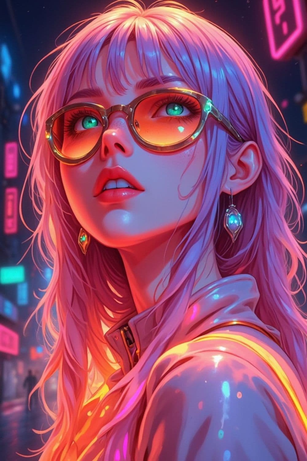 A vibrant illustration features a young woman with pink and purple hair illuminated by neon lights. She wears oversized, orange-tinted sunglasses that reflect the colorful glow. Her eyes are vivid and captivating, adding a mystical aura. Her attire is shiny, with hints of pink and blue hues, complemented by a unique earring that mirrors the vibrant palette. The cityscape background enhances the futuristic and urban feel.