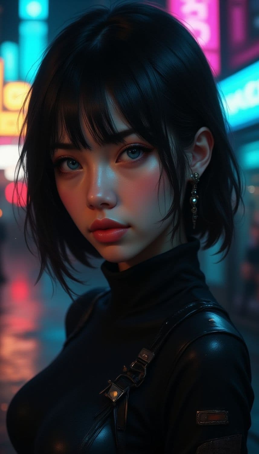A captivating young woman stands in an urban setting, surrounded by colorful neon lights. Her dark hair frames her face, and she wears a sleek, black outfit with a shoulder strap. Her expression is intense and enigmatic, with striking blue eyes highlighted by the vibrant background.