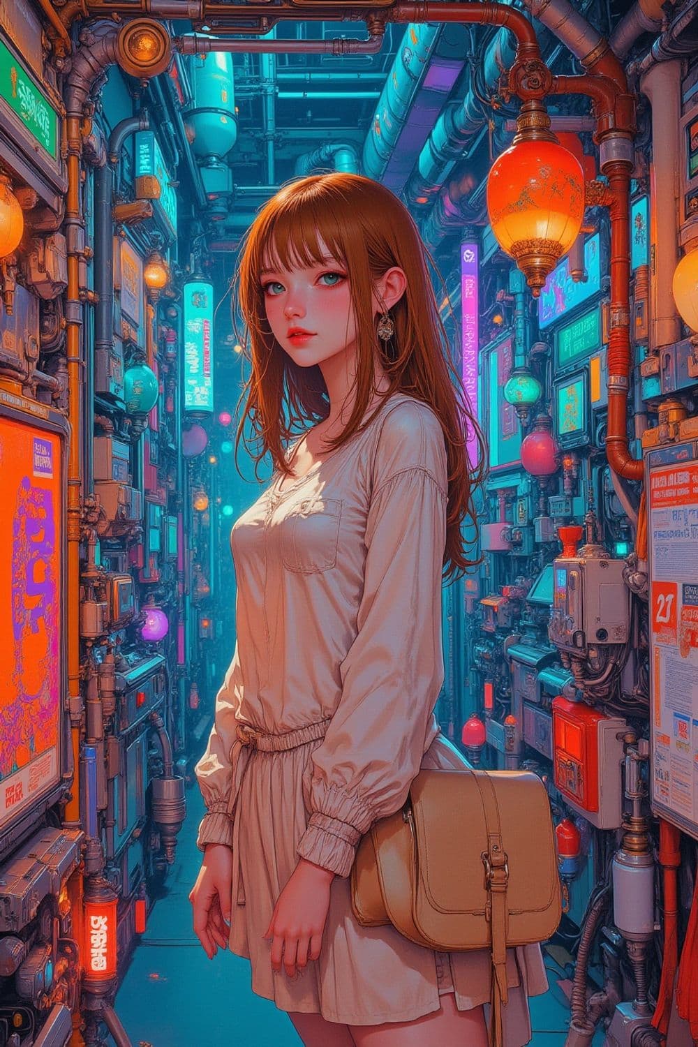 A young woman with long brown hair stands in an intricate hallway filled with mechanical elements and vibrant neon lights. She wears a light-colored dress with long sleeves and carries a tan shoulder bag. The futuristic setting is lined with colorful signs and glowing lanterns that create an ambient atmosphere.