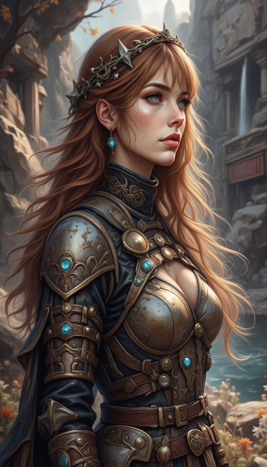 The image features a fantasy-themed female warrior with long, flowing auburn hair. She is adorned in intricate armor made of bronze and leather, embellished with blue gemstones. Her attire, including the shoulder guards and breastplate, is richly detailed with ornate patterns and designs. A crown of sharp, metallic spikes entwined with delicate vines rests on her head, enhancing her regal appearance. Her expression is resolute, and behind her is a blurred background of rocky terrain and foliage, suggesting a natural, adventurous setting.