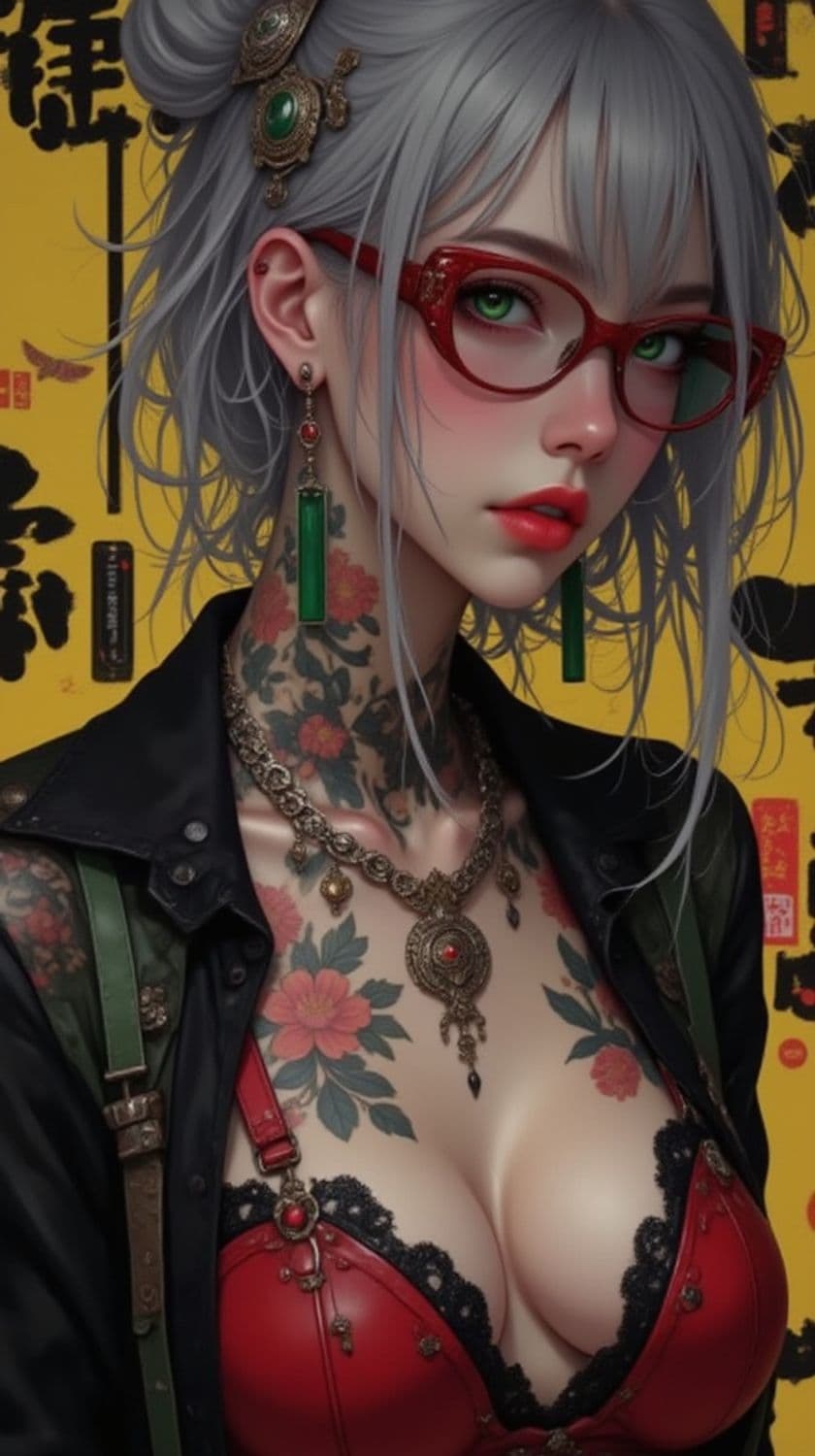 A striking character with silver hair styled intricately with ornate green and gold hairpieces, wearing bold red glasses. She has vivid green eyes and a half-updo hairstyle. Her neck and upper torso are adorned with floral tattoos, and she wears a leather jacket over a red and black corset with lace details. A large, ornate necklace complements her outfit along with green cylindrical earrings. The background features vibrant yellow with stylized black text, enhancing the character's vibrant appearance.