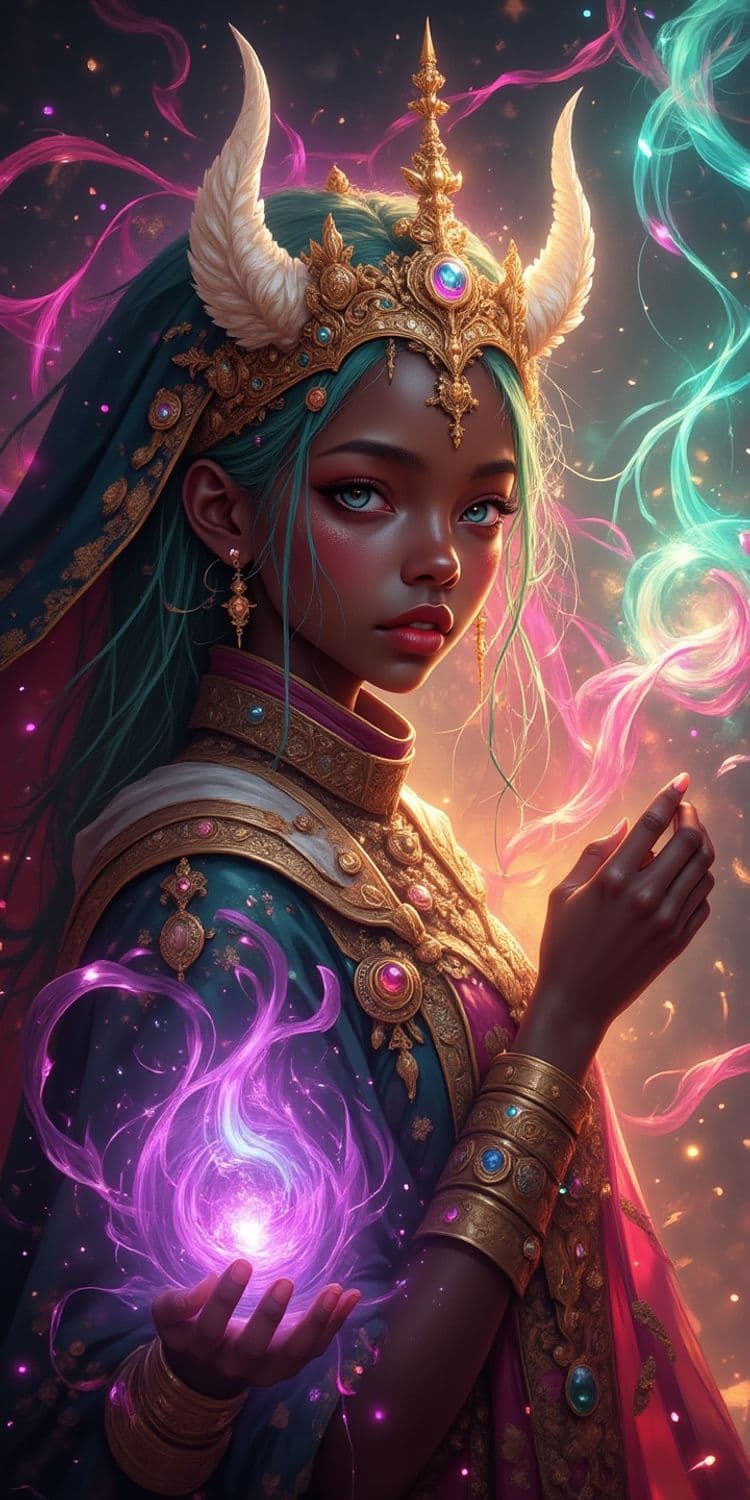 A mystical figure stands in an enchanted glow, adorned in elaborate golden armor and a regal headpiece with protruding horns. Their vibrant attire is accentuated by intricate patterns and jewels, matching the ethereal lights dancing around them. A magical, swirling orb of purple energy hovers above their hand, casting an enchanting aura.