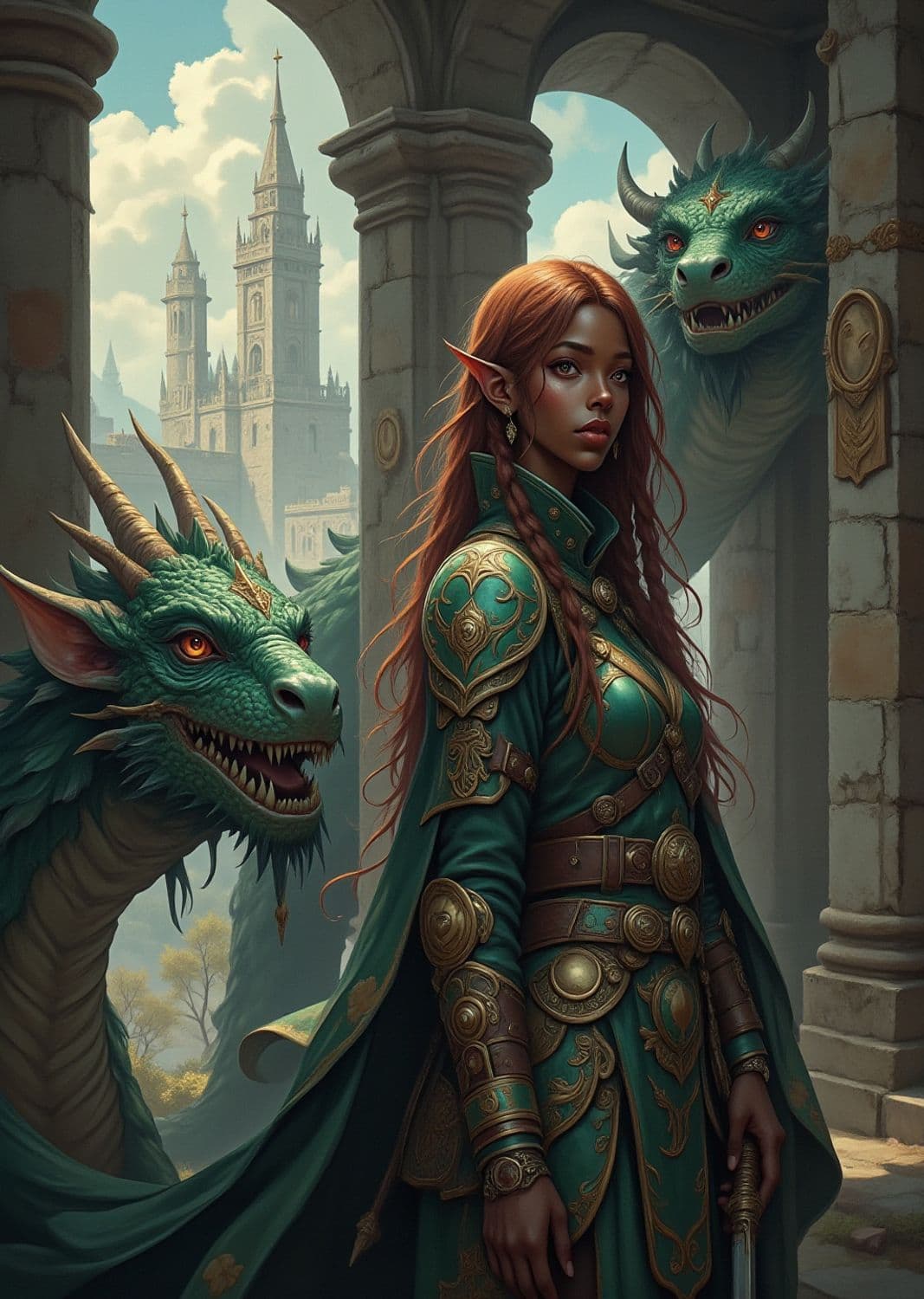 The image depicts an elven warrior with long red hair, standing in a stone archway with intricate engravings. She wears ornate green and gold armor, exuding a sense of nobility and authority. Beside her are two majestic dragons, their scales shimmering in shades of green and gold. In the background, towering castle spires pierce the sky amid fluffy clouds.