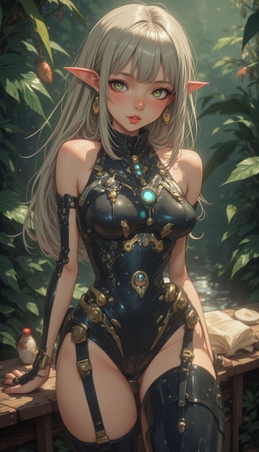 A fantastical elf-like character stands in a lush forest setting. She has long, silvery hair and striking green eyes. Her outfit is a sleek, form-fitting, futuristic-looking bodysuit adorned with glowing blue and gold accents, suggesting a blend of magic and technology. Her pointed ears are complemented by intricate gold earrings. The background is verdant, with dense foliage and a calm stream visible.