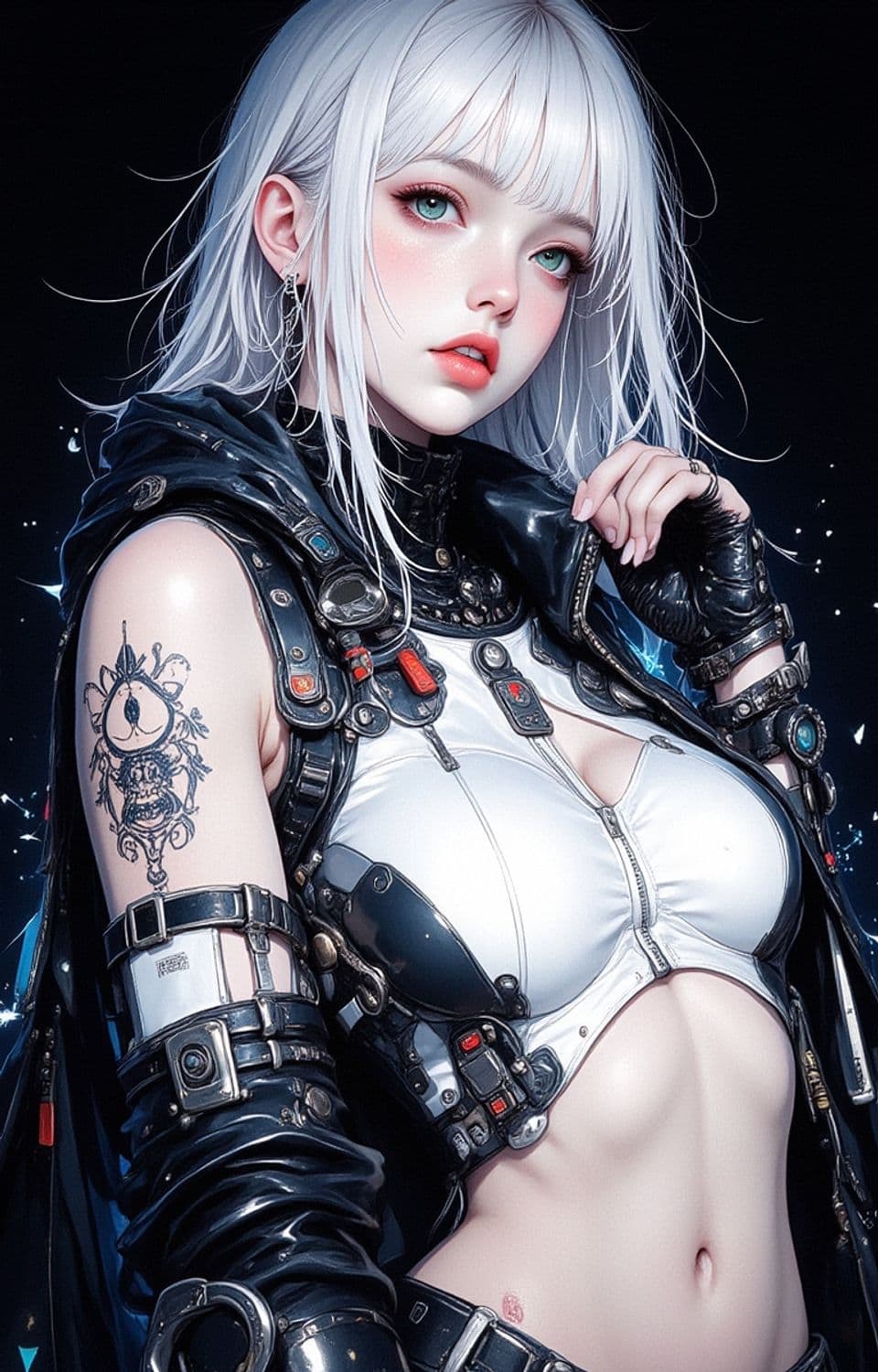 An ethereal character with striking white hair and turquoise eyes. She is adorned in a highly detailed, futuristic outfit with intricate metal and leather elements. Her arm displays a detailed tattoo, and she wears fingerless gloves and layered accessories, enhancing her otherworldly appearance. The background is dark with a scattering of ethereal light spots, adding to the mystical ambiance.