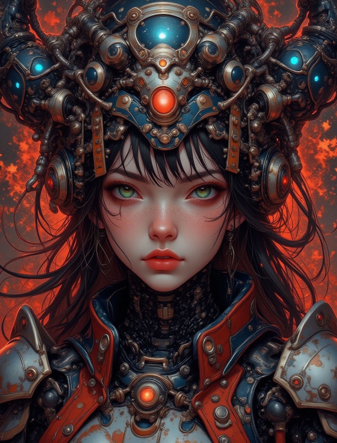 The image features a mysterious female figure with striking green eyes and fiery red lips. She wears an intricate, futuristic headpiece with glowing blue and red orbs. Her attire is a combination of mechanical and armor-like elements, blending metal and vibrant red and blue hues. The background is intense and fiery, enhancing the powerful and enigmatic presence of the character.