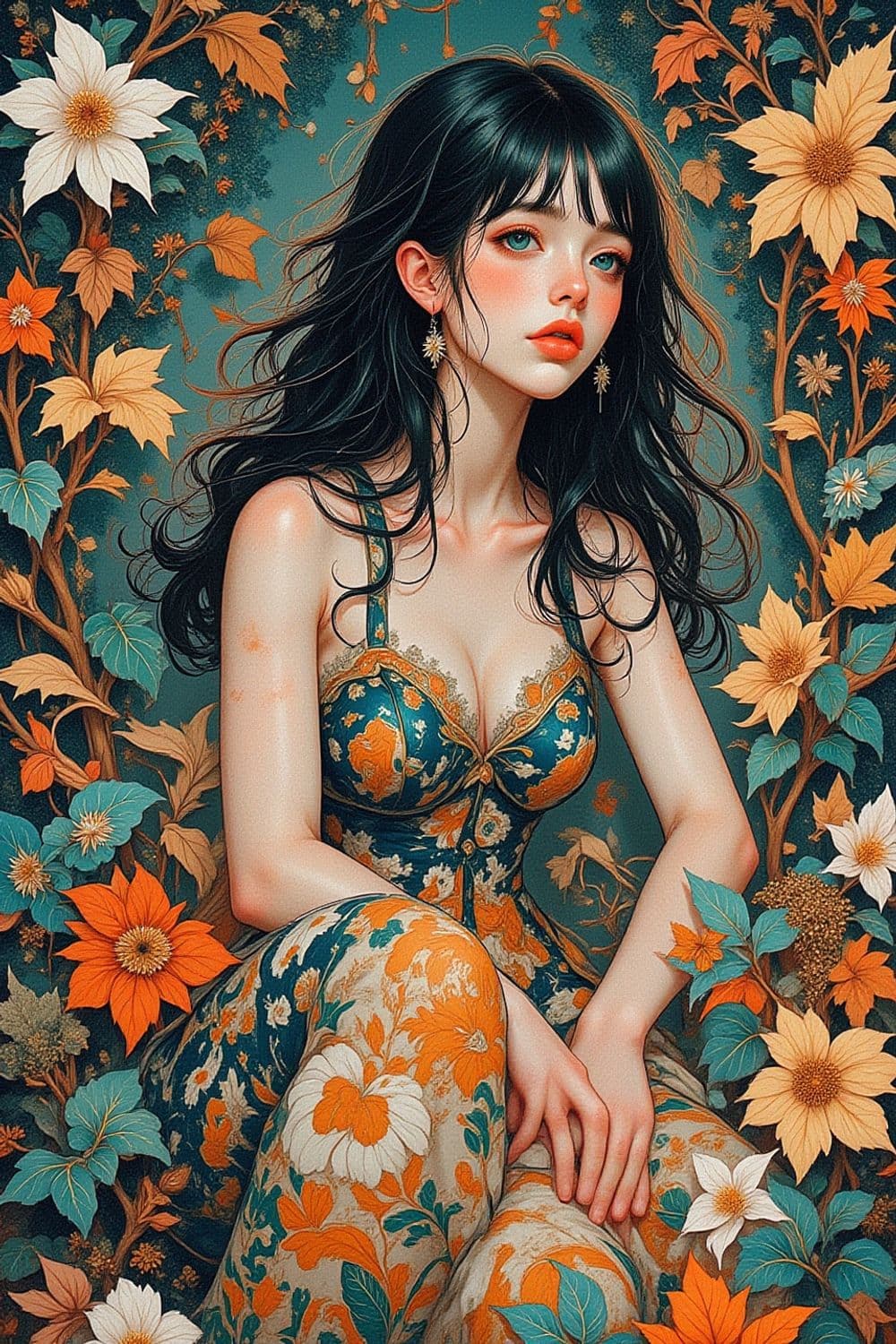 The image features a beautifully detailed illustration of a young woman with long dark hair, sitting amidst an abundance of vibrant flowers. She is wearing a floral dress with intricate patterns in shades of orange, teal, and cream. The background is filled with lush foliage that complements her attire, creating a harmonious and enchanting atmosphere.
