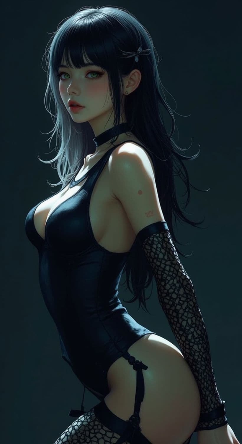 A captivating character with long, dark hair, featuring a striking contrast with strands of white. The individual has adorned themselves with a black, form-fitting outfit complemented by lace gloves. Their piercing eyes and delicate features are accentuated by soft lighting, creating a mysterious and alluring atmosphere.