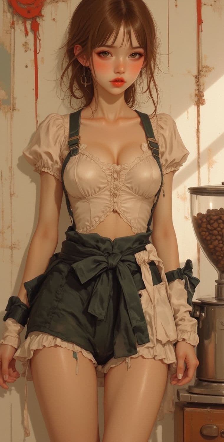 A digital artwork depicting a young woman with a vintage fashion flair, standing in a rustic kitchen setting. She wears a cream-colored blouse with puffed sleeves and dark green overalls adorned with a large bow. Her hair is styled in a loose, tousled manner, complementing her delicate makeup and expressive eyes. The background features subtle textures and softly muted tones.