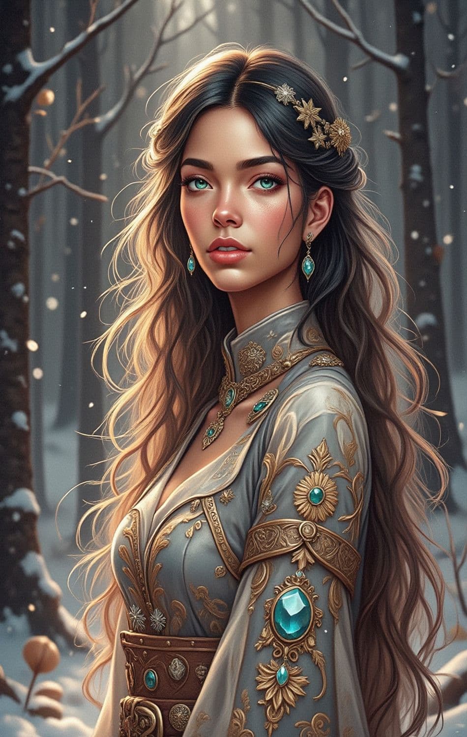 A captivating woman stands amidst a serene winter forest, with snow gently falling around her. Her attire is regal, featuring intricate embroidery and vibrant turquoise gemstones that adorn her jacket and accessories. Her long, flowing hair cascades over her shoulders, complemented by a golden floral headpiece. The woman's expression is serene and her bright eyes add a mystical allure to the scene.